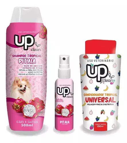 Aromas incríveis: Os aromas de frutas tropicais agora estão presentes no kit UP Clean Desenvolvido com o ativo que proporciona brilho, maciez e hidratação e muito mais... Esse kit não é apenas uma experiência olfativa, mas também uma revolução no cuidado capilar. O kit tropical é mais que um conjunto de produtos; é um tratamento completo para nutrição e cuidados diários dos pelos do pet. Proporcionem a seus pets os cuidados que eles merecem Experimente agora e deixe seu pet envolvido em aromas e cuidados excepcionais!
